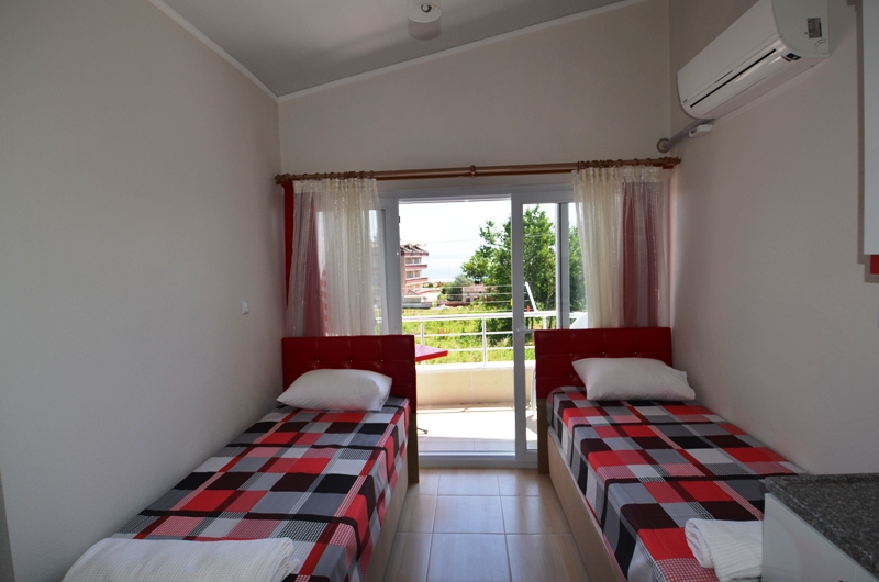 Üst katta 2 adet olan odalar 1+1 şeklindedir. Odalarda yatak düzeni ebeveyn odasında 1 adet çift kişilik ve diğer odada 2 adet tek kişilik şeklindedir, oda ek yatak koymaya müsaittir. Odaların ikisi de deniz ve havuz manzaralıdır.